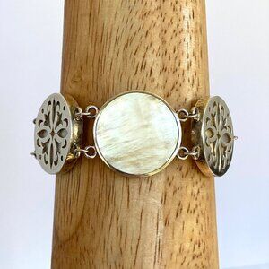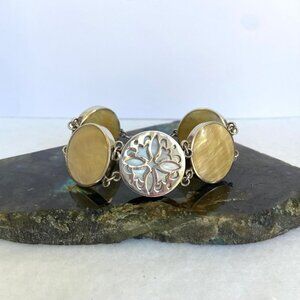 Sterling Silver 925 Alternating Round Pale Yellow & White Mother Of Pearl Floral Open Work Chunky Panel Bracelet With Gorgeous Luminosity