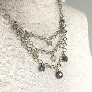 Sterling Silver 925 Multi Gemstone Multi Chain Layered Flat Hammered Cable Chain Necklace