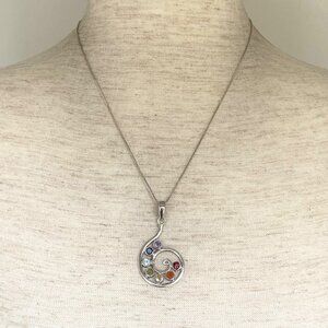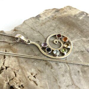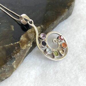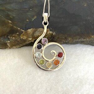 Sterling Silver 925 Multi Gemstone Rainbow Spiral Chakra Pendant Necklace 18"