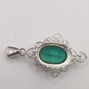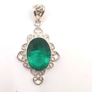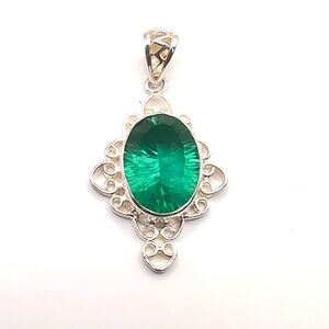 Marked Sterling Silver 925 Ornate Multi-Faceted Lab Created Emerald Pendant. The pendant is approximately 2 1/2" long (including bale) x approximately 1 1/4" wide. This beautiful dramatic exotic piece is sure to get noticed. I have a matching ring in my closet.