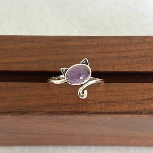 Sterling Silver 925 Oval Amethyst Cabochon Kitty Cat Band Ring