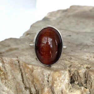 Sterling Silver 925 Oval Bezel Set 0.75" Tigers Eye Cats Eye Quartz Ring Sz 6.5