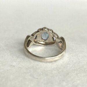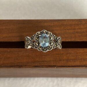 Sterling Silver 925 Oval Blue Topaz & Marcasite Floral Split Shank Ring Sz 7.5