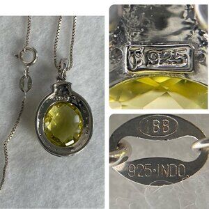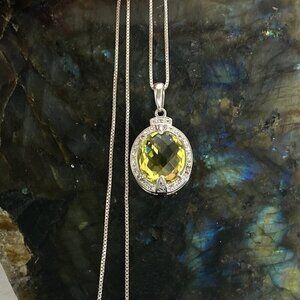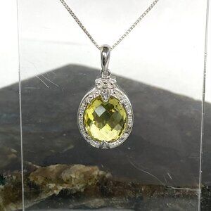 Sterling Silver 925 Oval Domed Faceted Yellow Citrine & Diamond Pendant Necklace