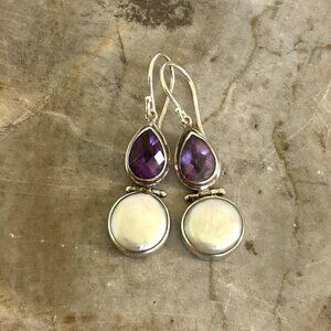 Sterling Silver 925 Pear Shaped Amethyst Hinged Genuine White Coin Pearl Dangle Earrings