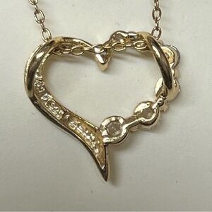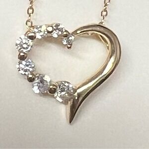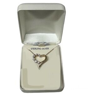 Beautiful, fine yellow gold plated sterling silver chain with open heart pendant with six graduated cubic zircon diamonds on one side. New in the box. Chain measures 18” and pendant is approximately 3/4” by 3/4”.