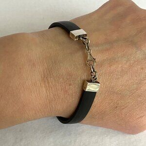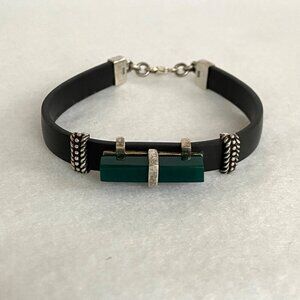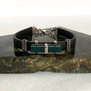 Sterling Silver 925 Rectangular Green Acrylic Flat Rubber Black Banded Bracelet