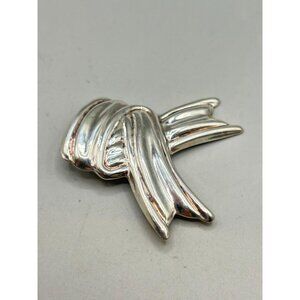 This elegant brooch features a classic ribbon design, crafted from sterling silver. It is made in Taxco, Mexico, known for its high-quality silverwork.