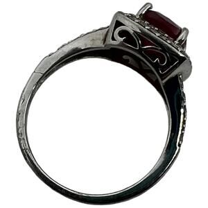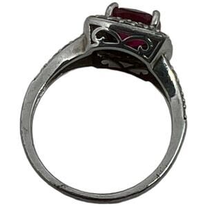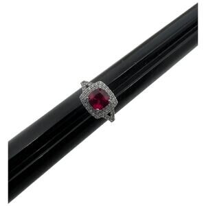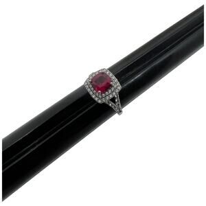 Stunning sterling silver ring (marked SUN 925) featuring a cushion-cut deep ruby red cubic zirconia center stone surrounded by a double halo of clear CZ stones. Art Deco-inspired design showcases intricate split shank detailing and pavé set accent stones along the shoulders. Ring is size 6.5. The center stone displays a rich, vibrant red color that pairs beautifully with the sparkling clear CZ border. Crafted in a vintage-inspired style with oxidized silver finish. Ring is in good pre-owned condition with all stones intact and minimal wear to the setting.