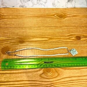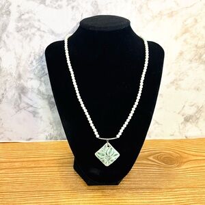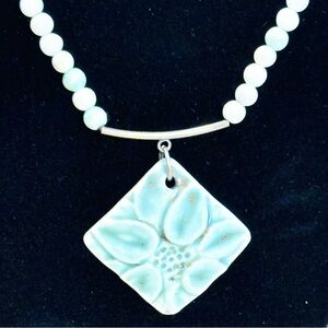 Description: rustic necklace with a carved flower pendant and matching round beads. I believe the pendant is a carved shell. It has an interlocking sterling silver clasp.