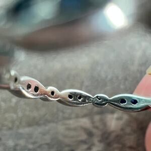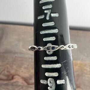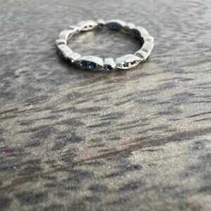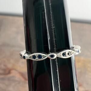 Gorgeous simple dainty ring in gently used condition. I don't have a gem tester but this looks like small sapphires - not sure though. Would be a beautiful non-traditional wedding band. Great for a wedding, gala, black tie event, holiday party, or prom.