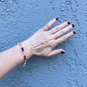 Vintage 925 bracelet. Nice gemstone barrel bead link bracelet. Stones include gjade, onyx, and red jasper. No makers mark. Models wrist is small.