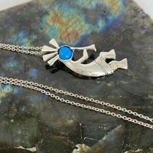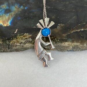 Sterling Silver 925 Southwest Kokopelli Faux Turquoise Pendant Necklace