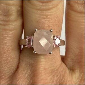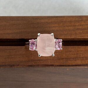 Sterling Silver 925 Checkerboard Faceted Prong Set Rose Quartz & Pink Cubic Zirconia Accent Ring