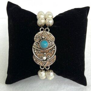 Sterling Silver 925 Two Strand Baroque Pearl Turquoise Bali Clasp Bracelet