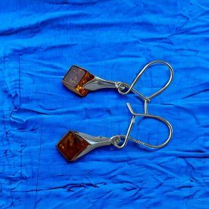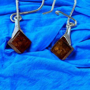 Sterling Silver 925 Women's Amber Drop Dangle Cube Shape Earrings