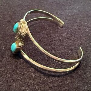 Vintage Sterling Silver 925 Turquoise Cuff Bracelet. Beautiful handcrafted cuff bracelet featuring two genuine turquoise stones set in sterling silver (marked 925). The elegant design includes a feather motif with intricate detailing, giving it a classic Southwestern or Native American-inspired look. Perfect for layering or wearing solo as a statement piece. Excellent condition. Please see pictures.