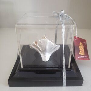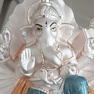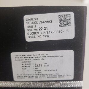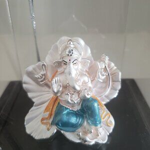 Sterling silver 999 purity Ganesha idol. The dimensions: 14cm x 11cm x 14cm Preowned only flaw is a little flaw in the corner of the display box. Last picture shows it. Very much unnoticeable. My price is adjusted for this very small detail. Retail sells for $194.00 Non smoking pet free home.
