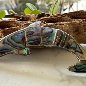 This vintage sterling silver brooch features a beautifully crafted dolphin inlaid with vibrant abalone shell. Signed EPB and hallmarked 925 for authenticity, it showcases exquisite craftsmanship and a timeless design. A unique collectible and a statement piece of jewelry.