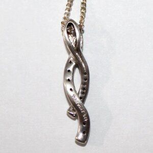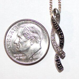 Sterling silver necklace with small minimalist abstract ribbon pendant. Pendant is set with tiny white and black stones which were too small to test with my presidium gem tester so I do not know what type the stones are.