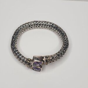 A Sterling Silver bypass bracelet with two amethyst gemstones and crystal. Stamped with 925 for Sterling Silver and I believe 14k gold plated in certain areas. Missing one crystal on the band. Good used condition other than the missing stone.