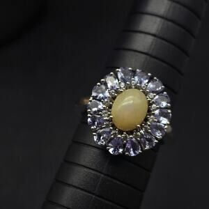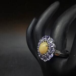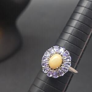 This sterling silver ring features amethyst stones surrounding an opal center and fits a US size 10