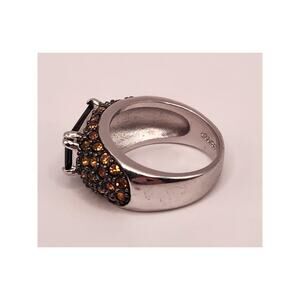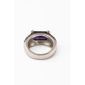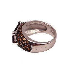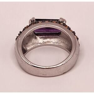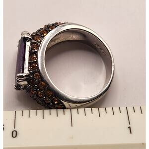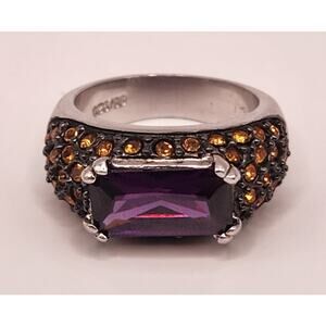 Size 6 women’s amethyst statement ring in solid .925 sterling silver. Features a large rectangular purple amethyst center stone flanked by sparkling orange accent stones. Unique curved band design with side detailing. Ring weighs approx. 0.28 oz. Stamped .925 inside band. A bold and elegant piece with vintage vibes. See photos for measurements. Perfect for cocktail wear or everyday glam.