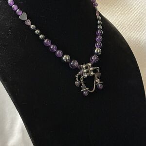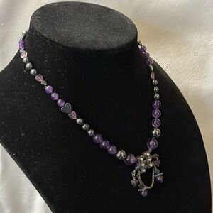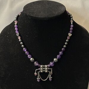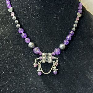 Great Pre-owned condition, silver has some tarnishing. May need light cleaning. Has an artist initial or mark on the back with '95. Purple beads test as amethyst, some of the darker colored beads test as Spinel. There are 2 sterling silver beads by the clasp. Both the lobster clasp and the silver metal pendant test as sterling.