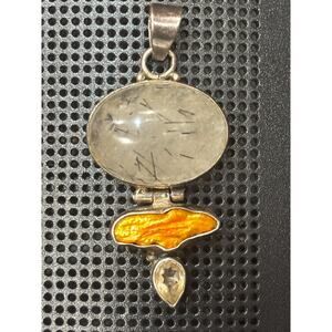 Sterling Silver Articulated Totem Pendant Tourmalinated Quartz Amber & Citrine