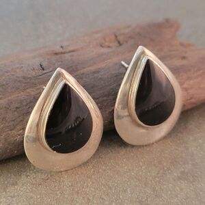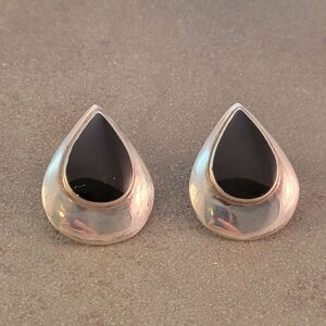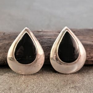Elegant sterling silver bezel set black onyx cabochon post statement earrings. The sterling silver has been tested and confirmed as genuine.