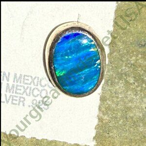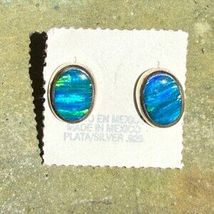 Pre-owned sterling silver pieced post stud earrings set with blue opals that I believe are lab created. They were made in Mexico and are still on original card. They measure 10mm by 7mm. Weight 1.2 grams together. Marked 925 and Mexico on the back of earrings.