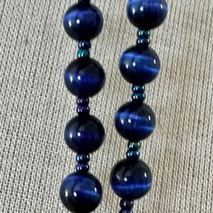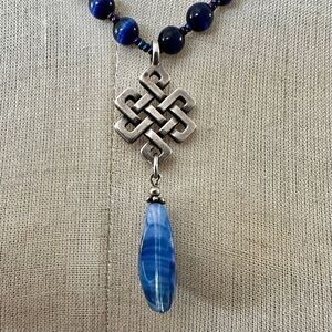 Beautifully handcrafted necklace featuring deep blue tiger’s eye beads that shimmer with a chatoyant glow, accented by a sterling silver Celtic knot and a banded blue agate teardrop pendant. The clasp is stamped 925 for sterling authenticity.