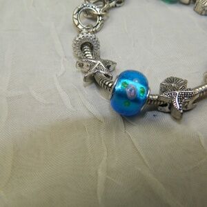 Sterling Silver European Charm Bracelet features Beach Themed Blue Glass Starfish Shell charm. 7.5" sterling silver bracelet. Shell lobster claw clasp (not sterling). Artisan lampwork glass beads