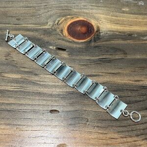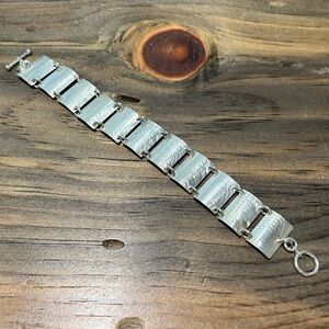 Statement piece! This handcrafted sterling silver bracelet features a series of rectangular panels, each with a unique brushed texture that catches the light beautifully. The panels are connected by sturdy rings, creating a flexible and comfortable fit. A secure toggle clasp ensures easy wear and removal. This bracelet adds a touch of modern elegance to any outfit, making it perfect for a night out, a special occasion, or even to elevate your everyday style.