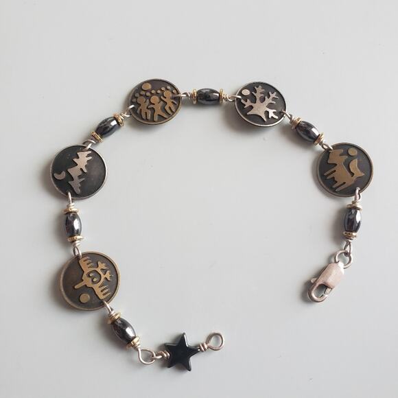 One of a kind, unsigned. Sterling clasp and wire with sterling antler & mountains charms linked with antiqued brass eagle, fox, and people charms. Hematite star and spacer stones.