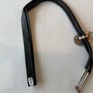 The braided leather cord is finished with sterling silver tips, and the upper section of the tie has a wider leather neck band for added structure and comfort. This bolo tie is new and unused, still retaining its original retail price tag of $600, making it a standout artisan collectible.