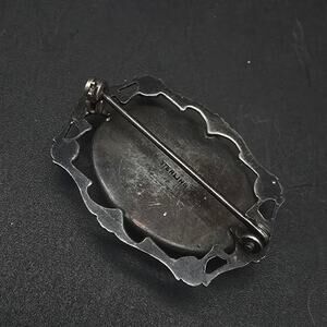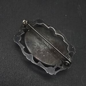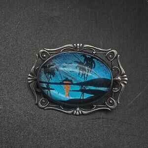 This vintage sterling silver brooch features a reverse painted beach scene with butterfly wing background and measures 1.25" x 1"