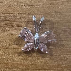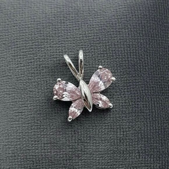 This lovely butterfly pendant is crafted from quality sterling silver and features eye-catching pink stones that resemble diamonds. It's the perfect accessory to add a touch of whimsy and elegance to any outfit.