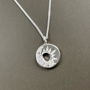 Introducing our stunning Sterling Silver CZ Moon and Sun Necklace - the perfect addition to any jewelry collection! This exquisite piece features a unique design that is sure to catch the eye, with a delicate moon and sun motif that symbolizes the balance between light and dark.