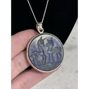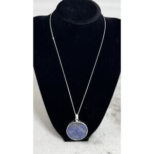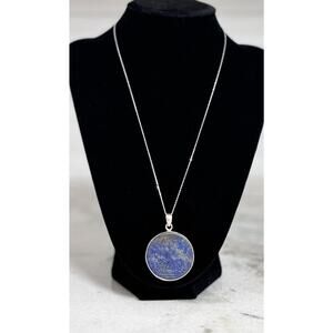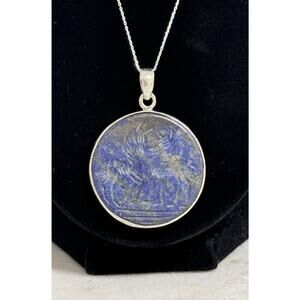 Sterling silver lapis lazuli carved pendant on 18” Italy sterling chain. Pendant measures just under 1 1/2 inches diameter. Both new, never worn. Unique statement piece. (#909)