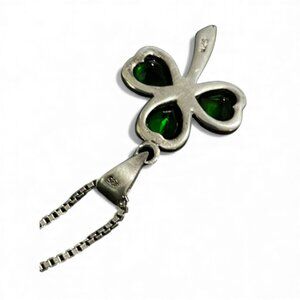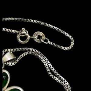 Lovely 925 sterling silver and green CZ Shamrock pendant necklace. Traditional Irish Celtic clover design. Very well made. Stamped 925. Pendant is on a vintage 925 sterling silver 16 inch box chain with a spring ring clasp.