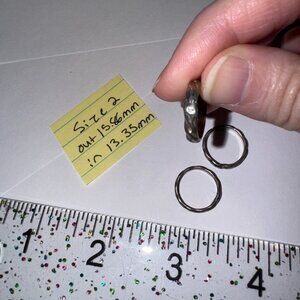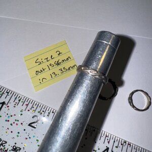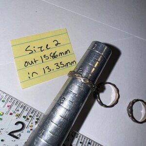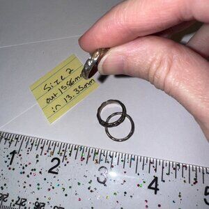 These are perfect for joint rings, baby rings, or people like me with tiny fingers. This is a 2 in a ring size. Measures about 15.93mm on the outside and 13.30mm on the inside. The band is 3.30mm thick. These rings also range in weight but the average ring weight 1.40 grams. Some bands may be larger than others.