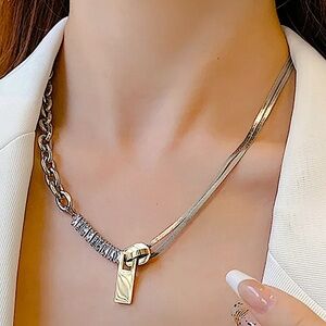 Sterling silver plated over stainless steel Rolo chain link zircon herringbone zipper choker punk necklace. Measures adjustable 17”-19””.