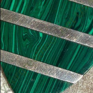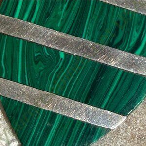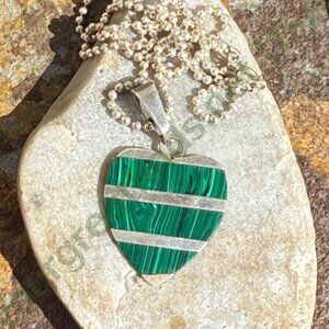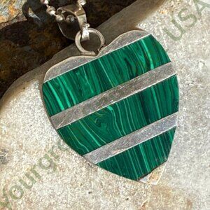 Vintage sterling silver heart pendant & chain necklace. The pendant has a thin profile and is channel inlay with green malachite. Heart is 7/8" wide and 1 1/2" tall with the bail. Ball chain is 15" long. Made in Mexico. Marked as such on the back and stamped 925