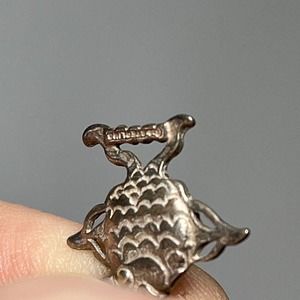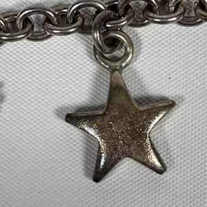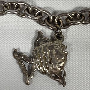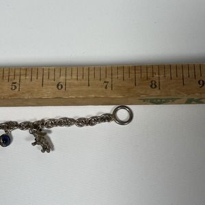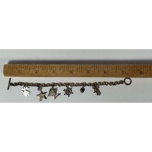 This vintage sterling silver charm bracelet is a unique piece of jewelry that will add a touch of personality to any outfit. The bracelet features an elephant, ship's wheel, fish, star, and a USMC charm dangle. Made with 925 silver, this bracelet measures 7.25 inches in length and has a toggle closure. The style is a combination of charm and bangle, making it a versatile accessory for any occasion. This original piece was crafted in the 1990s and is a perfect addition to any vintage jewelry collection.