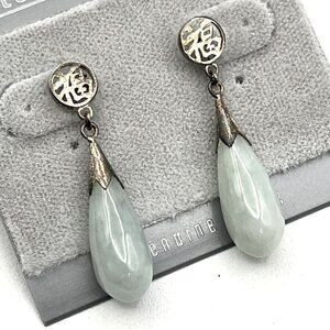 Sterling Silver Chinese Green Jade Torpedo Dangle Pierced Earrings New