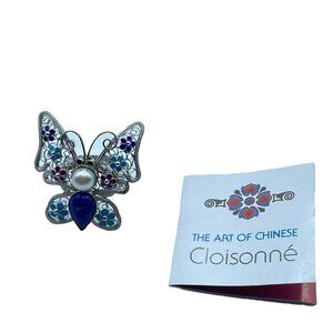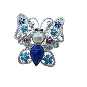 Amazing Sterling silver Cloisonné butterfly ring. This has very pretty cloisonné flowers on the wings. The body is made out of pearl and Lapis Lazuli. This is a large and beautiful ring in like new condition. This is designer signed!