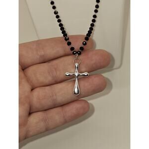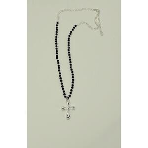This elegant handmade necklace features a sterling silver cross pendant on a lightweight black rosary and circle-pattern sterling silver chain. Perfect for layering or wearing solo, this versatile piece adds a modern touch to Christian jewelry. The necklace measures approximately 18.5 inches in length with a 2-inch extender, allowing for adjustable wear. Ideal as a gift for Christian religious occasions, spiritual celebrations, or everyday wear. Crafted with attention to detail, this handmade piece combines timeless design with minimalist style.