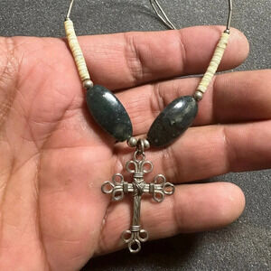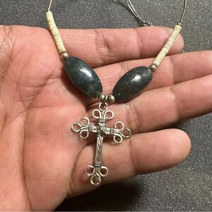 Sterling Silver Cross Pendant And Agate Natural Stone Beaded 16 Inch Necklace unmarked but acid tests as silver see pictures for reference