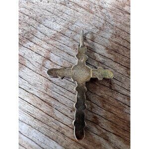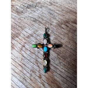 This handcrafted sterling silver cross pendant features a vibrant array of inlaid gemstones, each adding unique character and charm. Its vintage allure is complemented by the intricacy of its design, making it a meaningful keepsake or a standout accessory. The delicate craftsmanship highlights its enduring quality and spiritual significance.